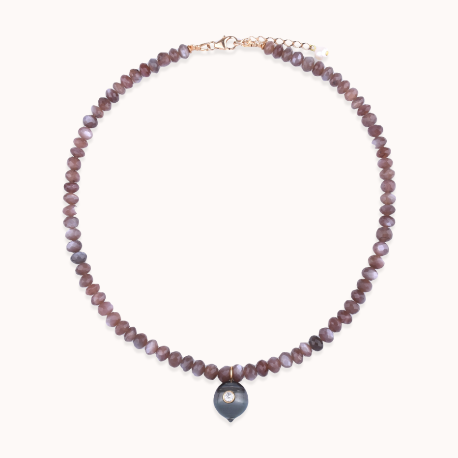 Bronze yellow gold vermeil, chocolate moonstone, tahiti pearl and white topaz necklace.