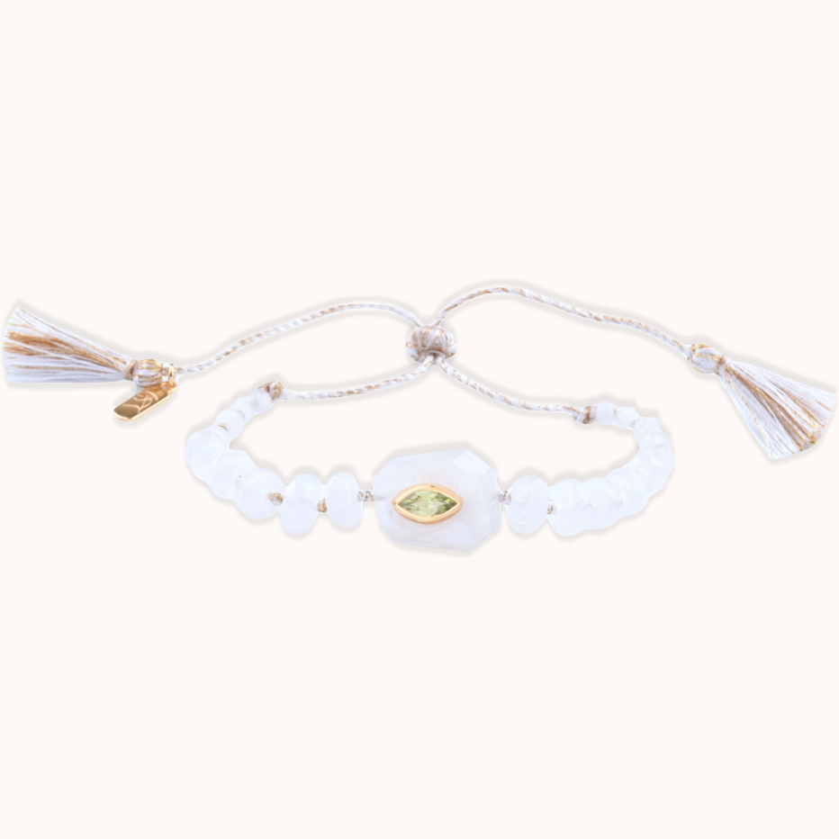 Bronze yellow gold vermeil, cotton thread, moonstone and peridot bracelet.
