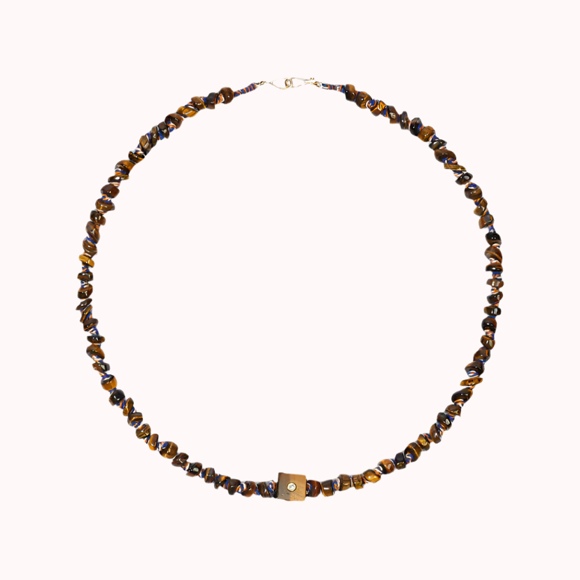 9kt gold, thread, tiger eye and diamond necklace.