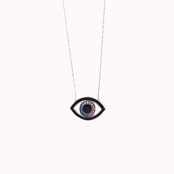 Sterling silver white rhodium plated, enamel and white zirconia necklace.