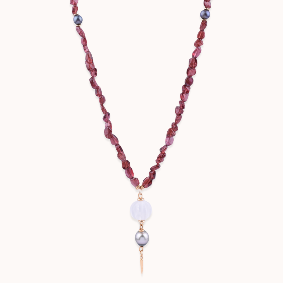 Bronze yellow gold vermeil, garnet, grey pearl, rock crystal and tahiti pearl necklace.