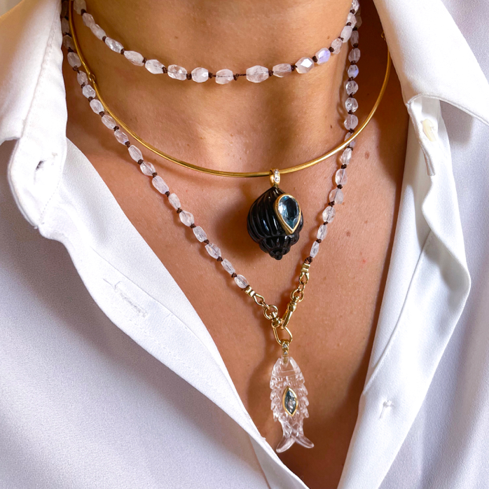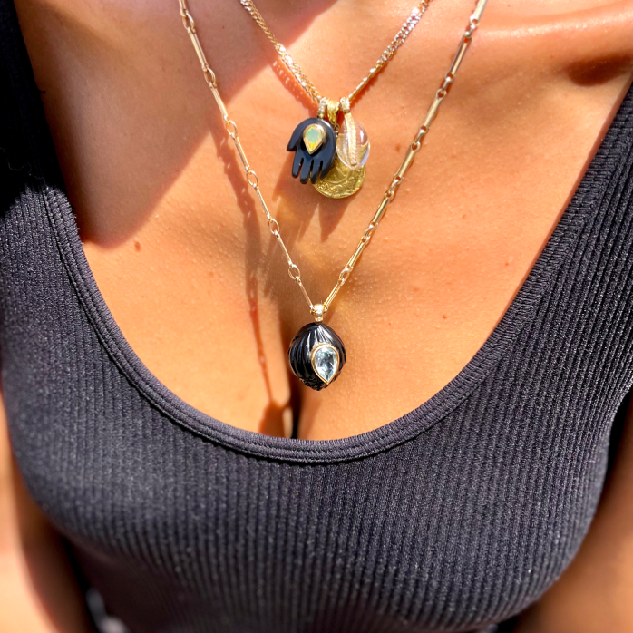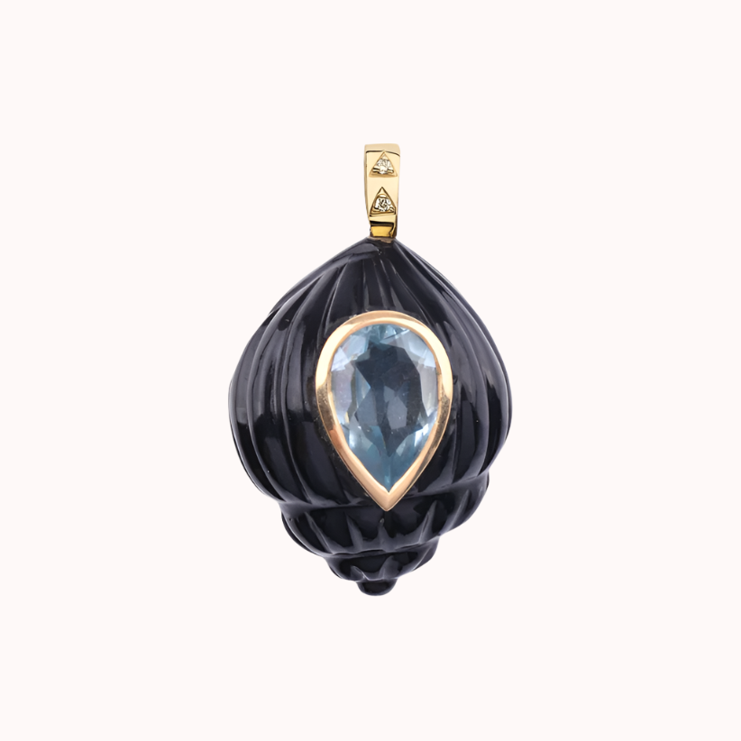 18kt yellow gold, onyx, blue topaz and diamond charm.