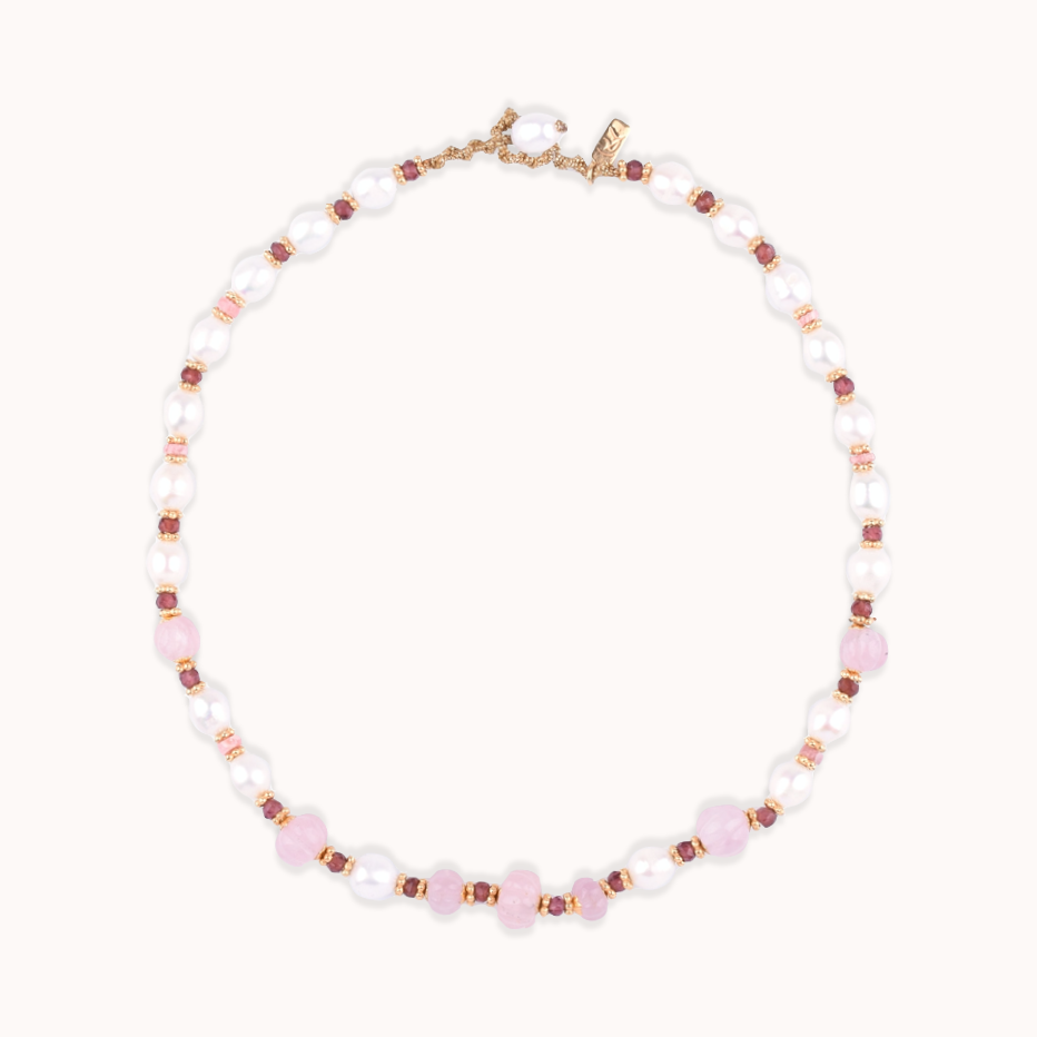 Bronze yellow gold vermeil pearl, garnet, rhodocrosite and pink quartz necklace.