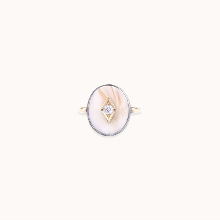 Sterling silver (oxidized), 9kt gold, bakelite and white zirconia ring.