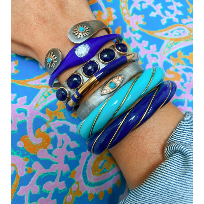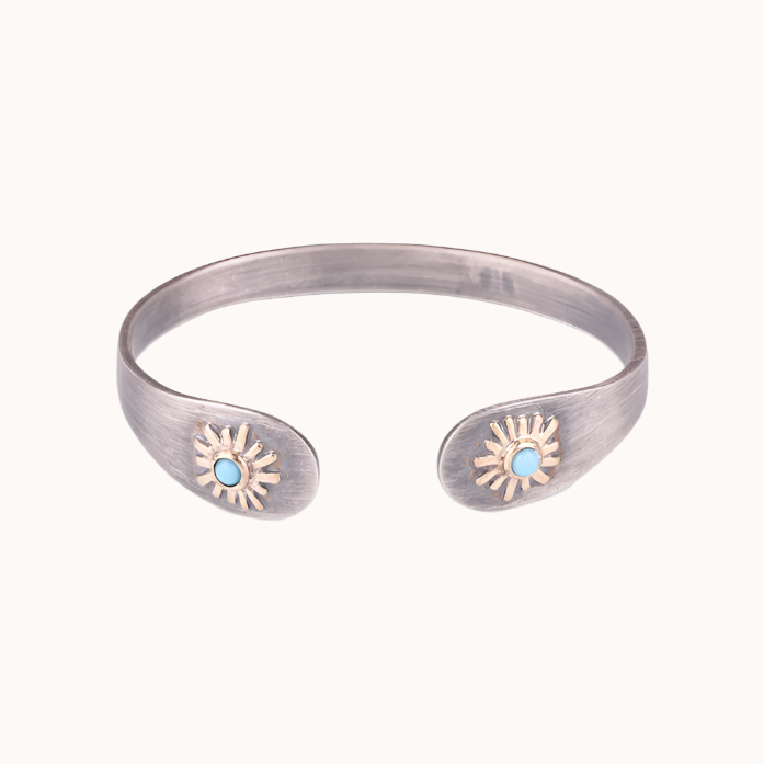 Sterling silver (oxidized), 9kt gold and turquoise cuff.
