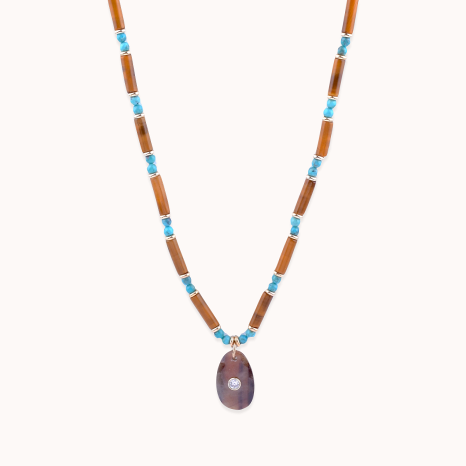 Bronze yellow gold vermeil, tiger eye, turquoise, yellow sapphire and white topaz necklace.