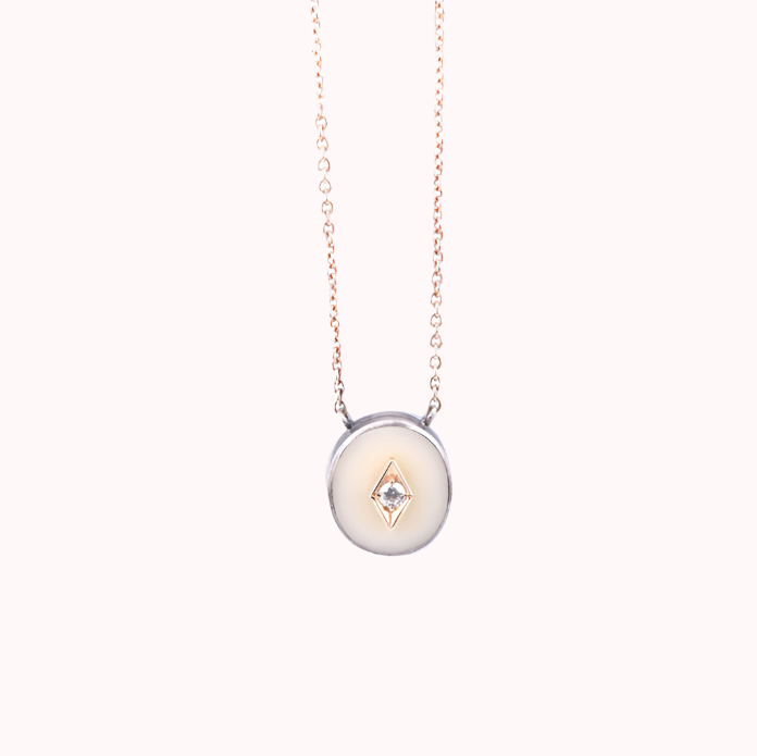 Sterling silver (oxidized), 9kt gold, bakelite and white zirconia necklace.