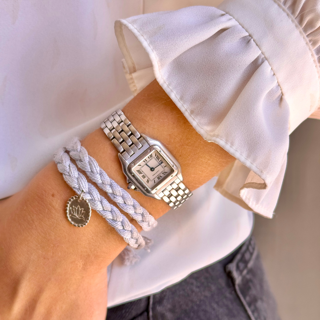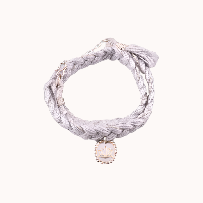 Pulseira em prata 925 com banho de ródio branco e fio de algodão.