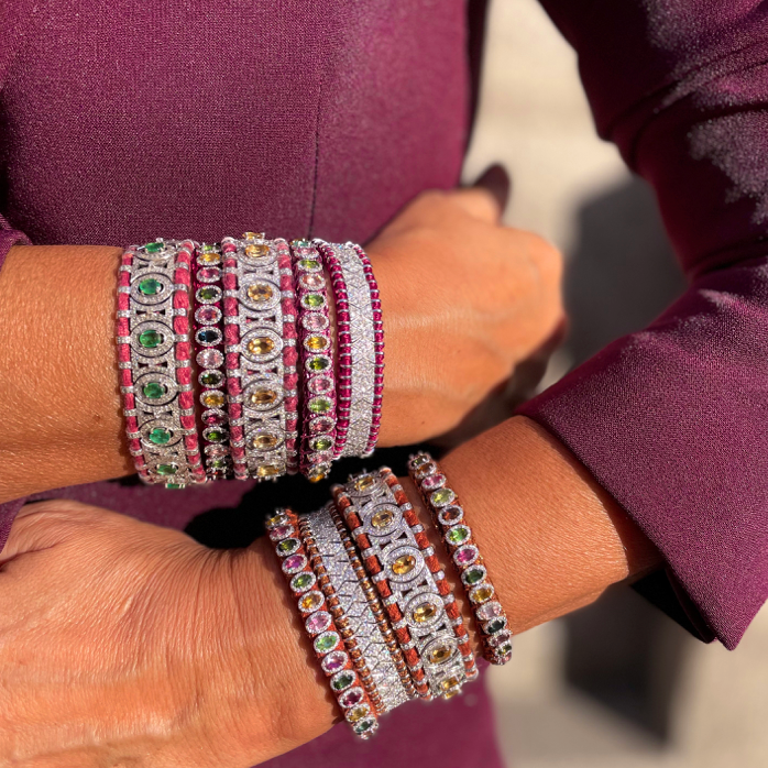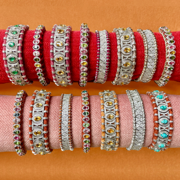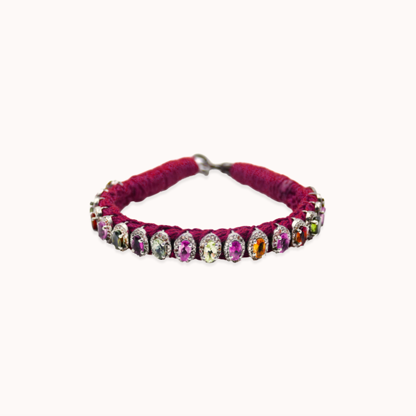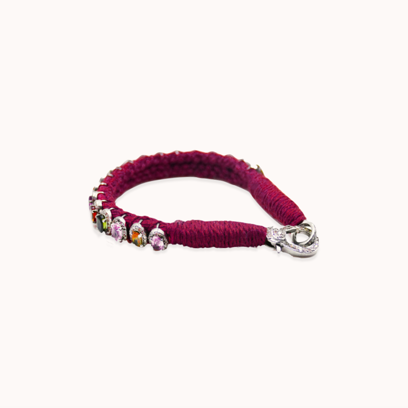Pulseira em prata 925, fio de algodão, turmalinas e diamantes.
