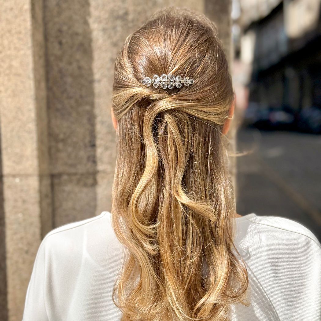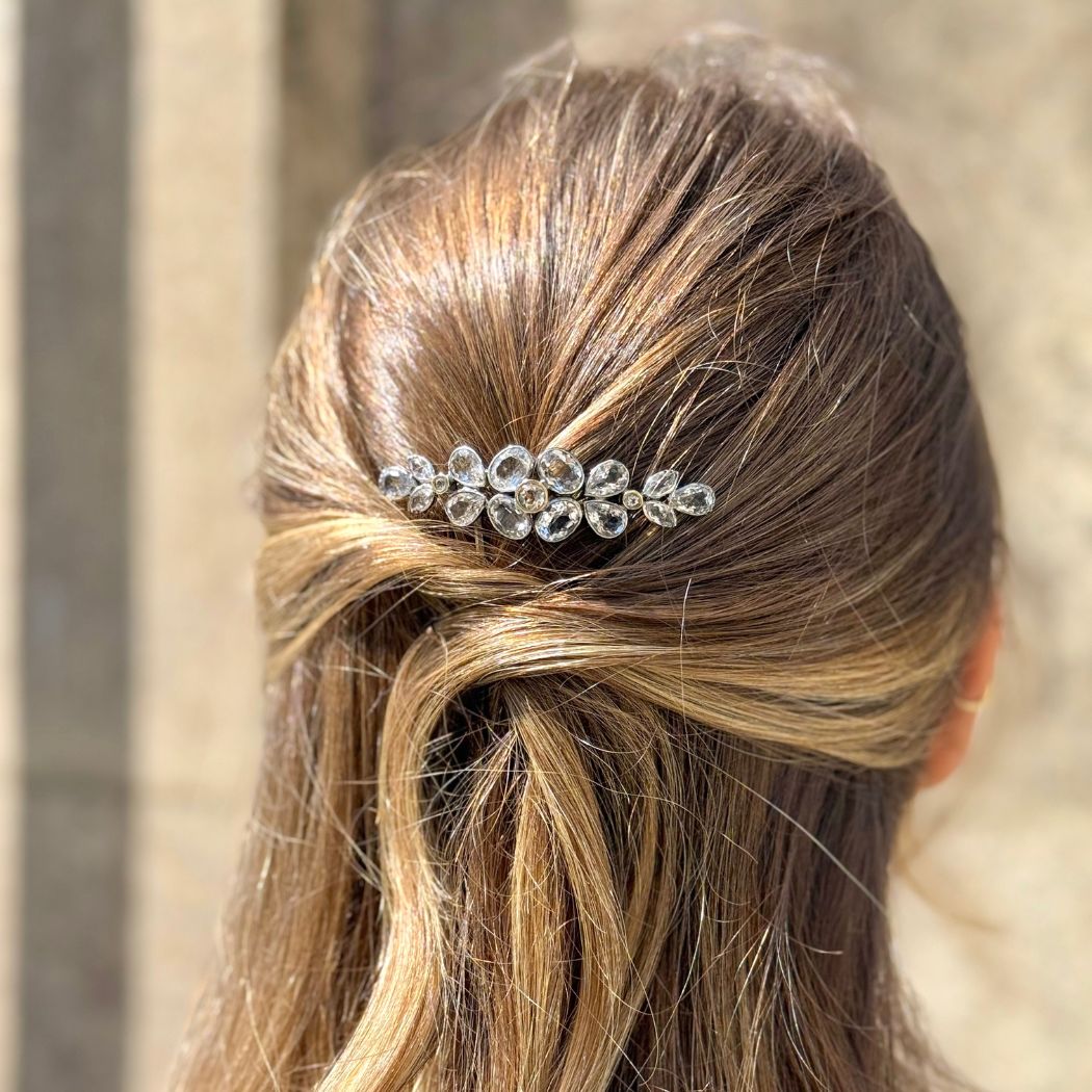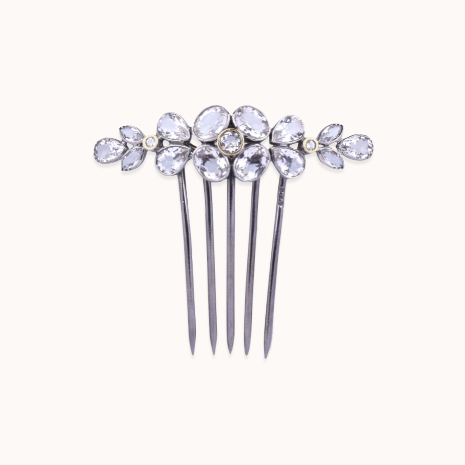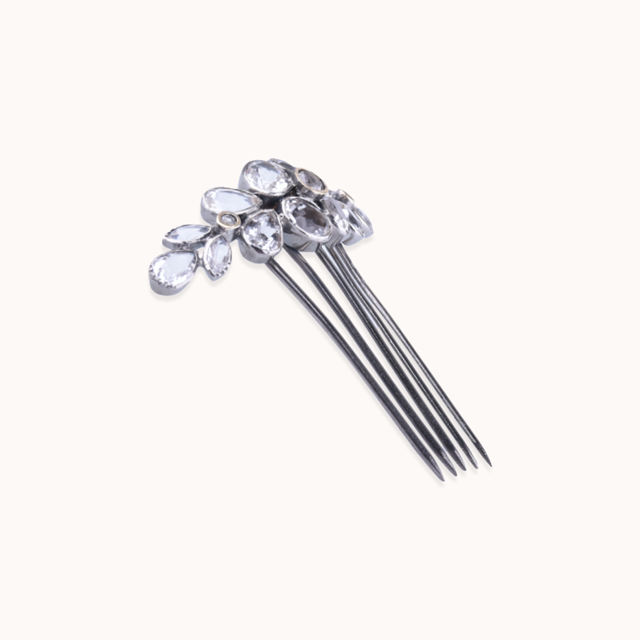 Pente para cabelo em prata 925 (oxidada), ouro de 9kt e cristal de rocha (minas novas).