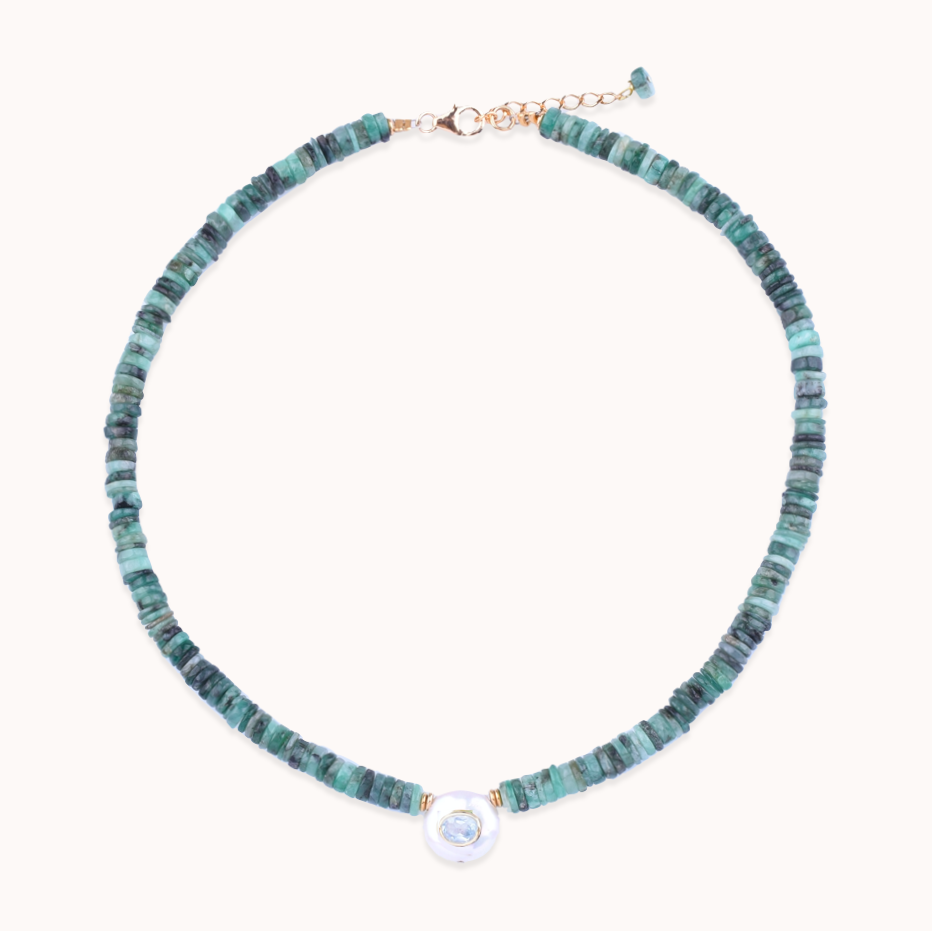 Colar em bronze vermeil, esmeraldas, pérola e topázio azul.