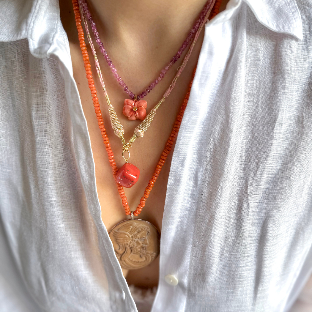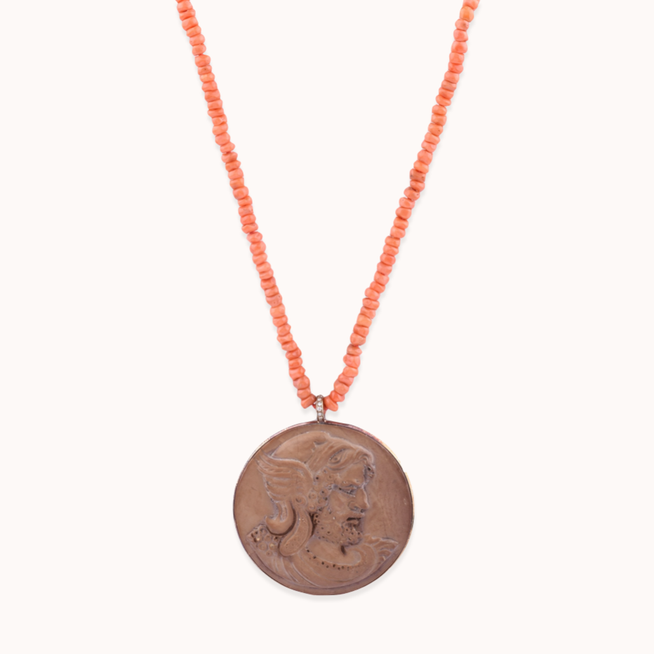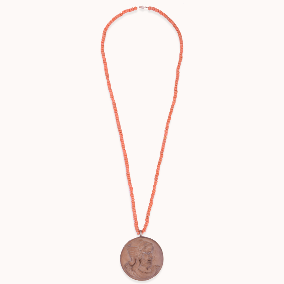 Colar em ouro rosa de 18kt, coral, camafeu de lava vulcânica e diamantes.