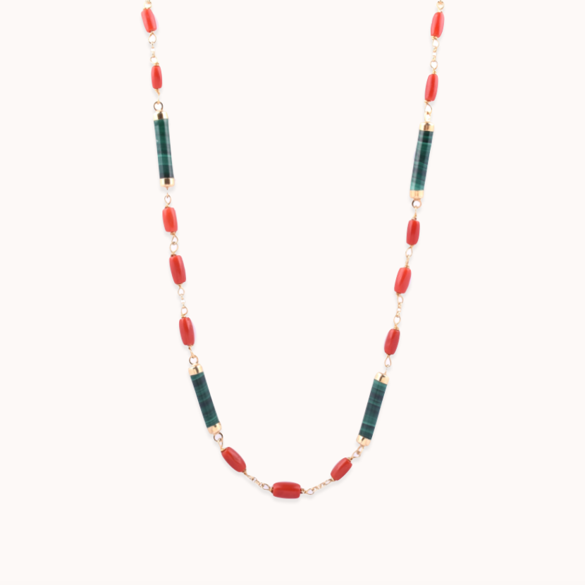 Colar em prata 925 vermeil, coral e malaquite.