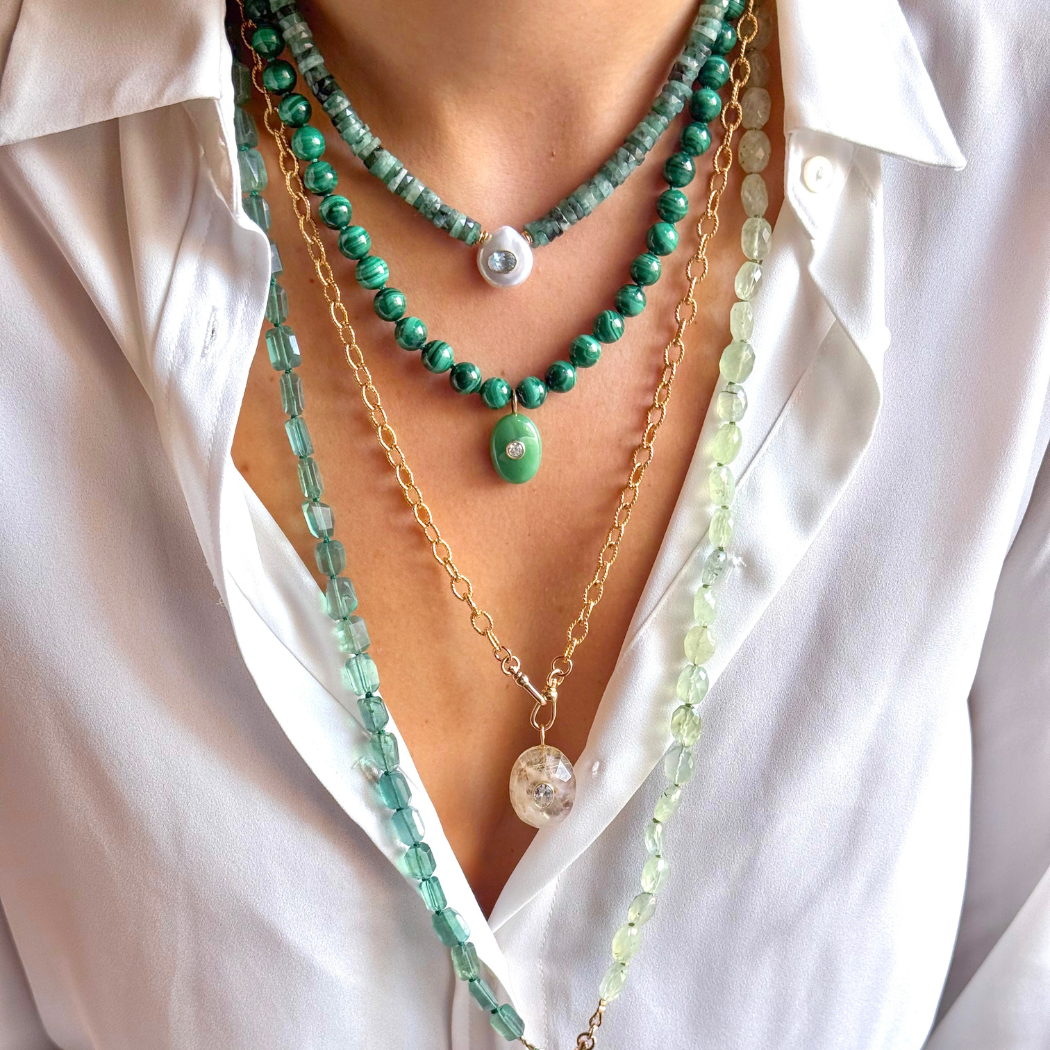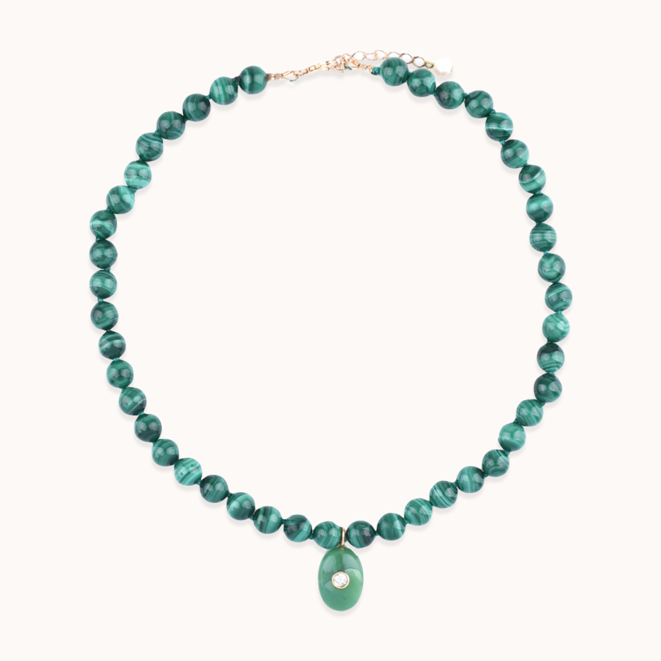 Colar em bronze vermeil, malaquite, crisóprase e topázio branco.