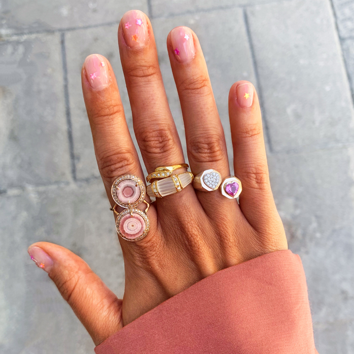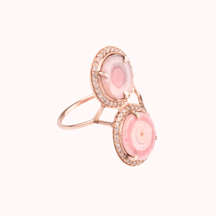Anel em ouro rosa de 14kt, rodocrosite e diamantes.