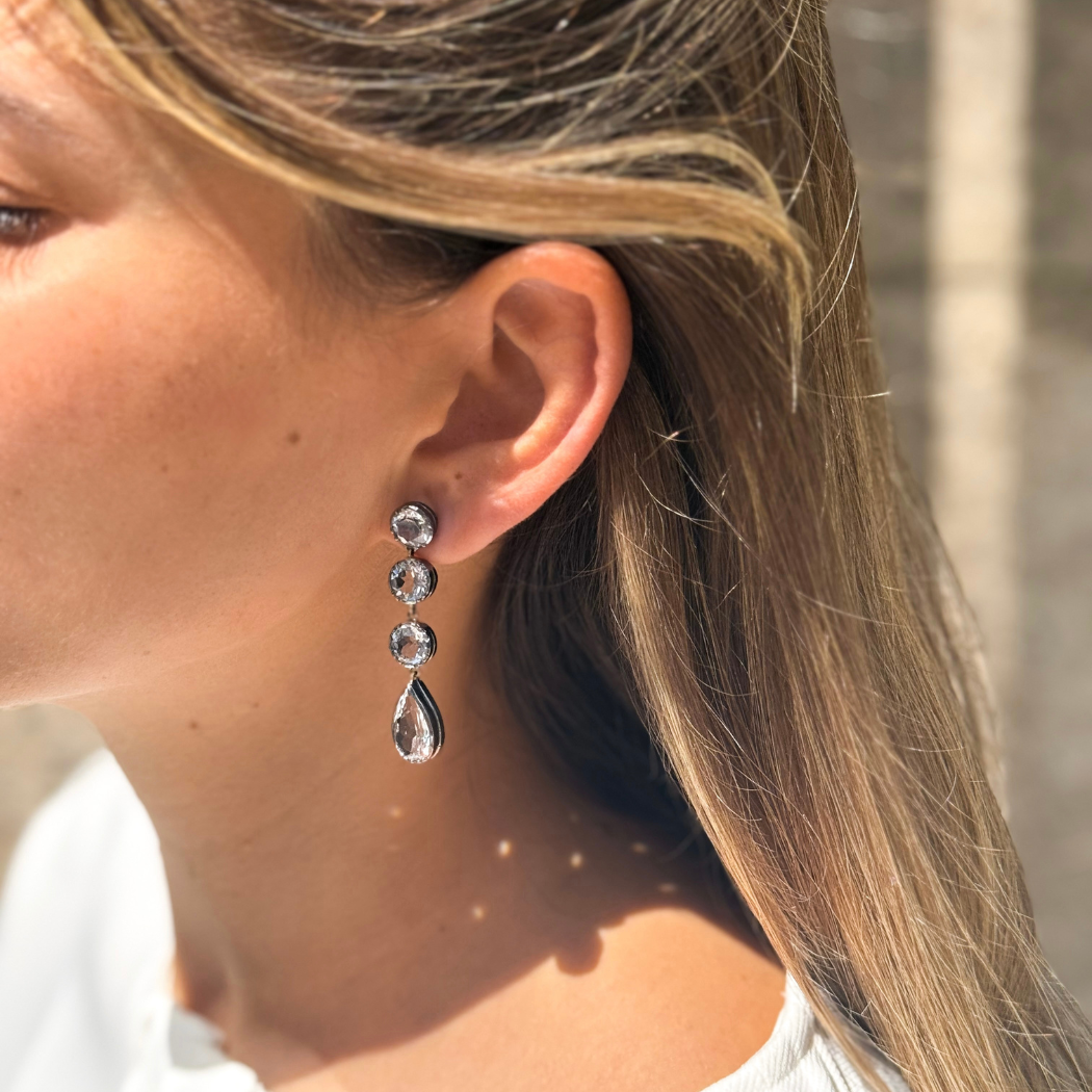 Brincos em prata 925 (oxidada), ouro de 9kt e cristal de rocha (minas novas).