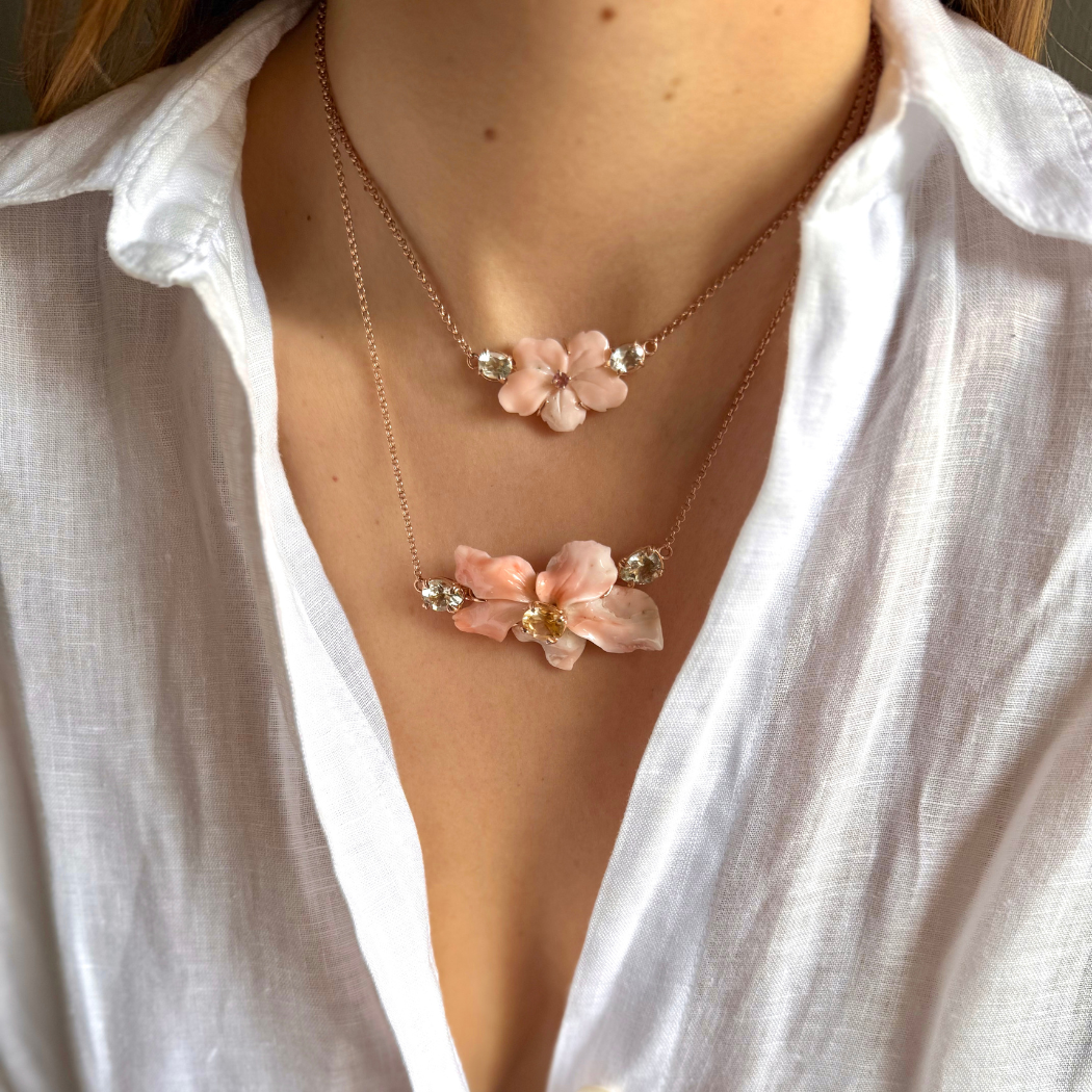Colar em prata 925 vermeil, coral, prasiolite e turmalina.
